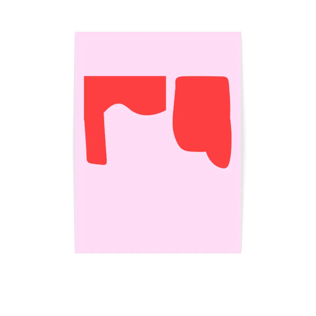 Två djärva röda former möts över ett mjukt rosa fält och skapar en stark balans mellan rörelse och stillhet. De organiska kurvorna antyder ett stilla samtal mellan former, och ger rummet energi utan att ta över.