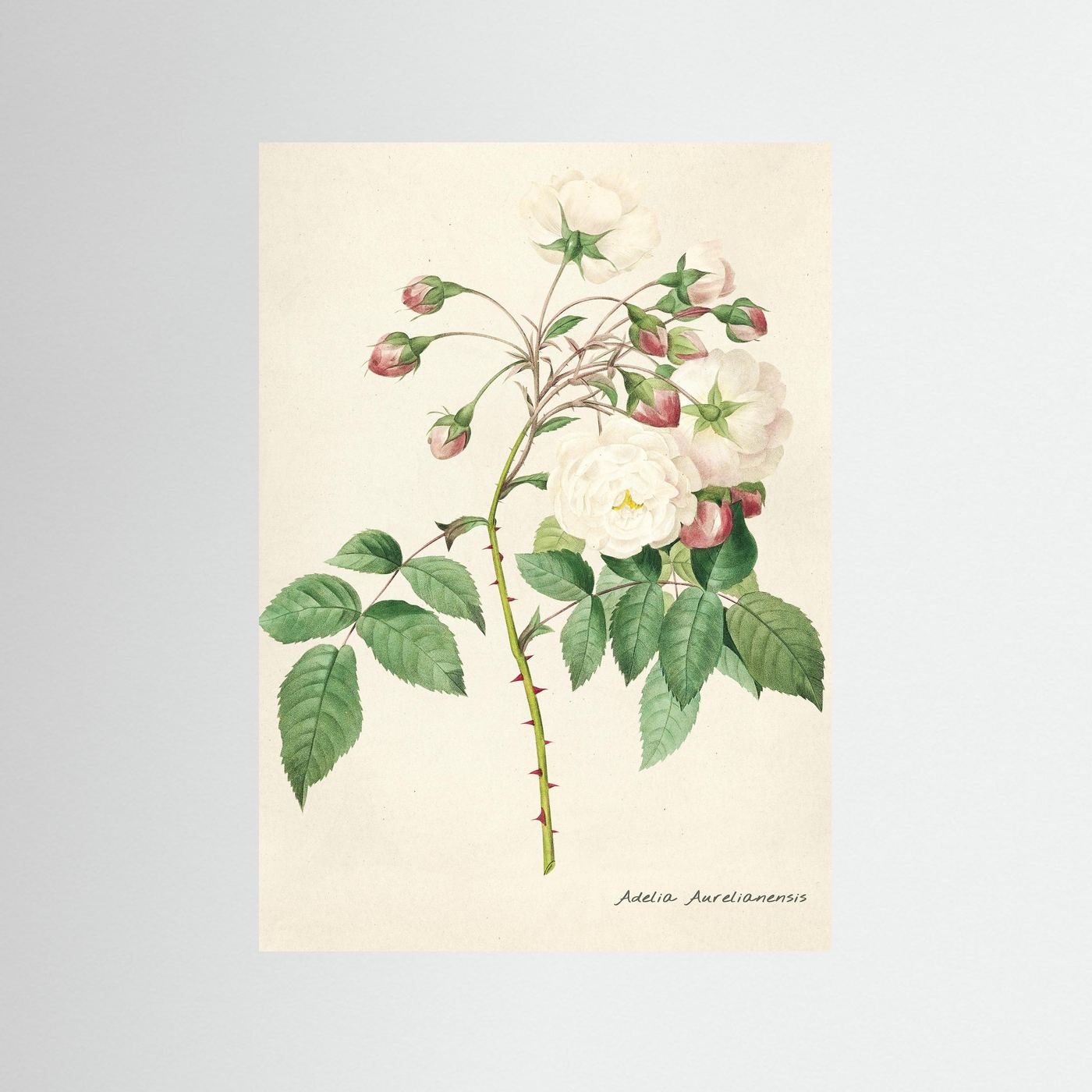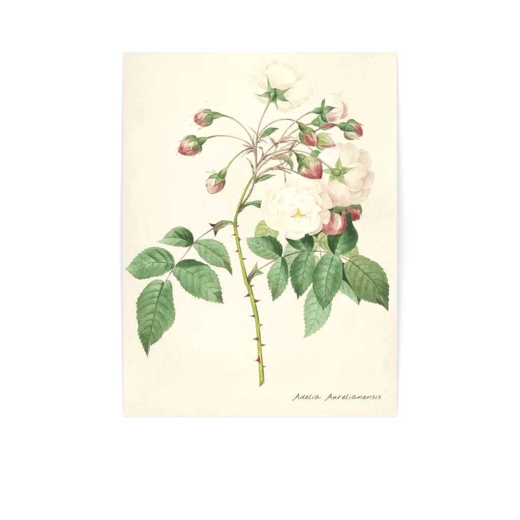 En fin botanisk studie återgiven i mjuka akvarelltoner. Vita blommor öppnar sig bredvid rosa knoppar på taggiga stjälkar och fångar den varsamma karaktären hos klassisk rosenodling. Den krämfärgade bakgrunden och den handskrivna noteringen för in känslan av 1800-talets botaniska arkiv i samtida hem.