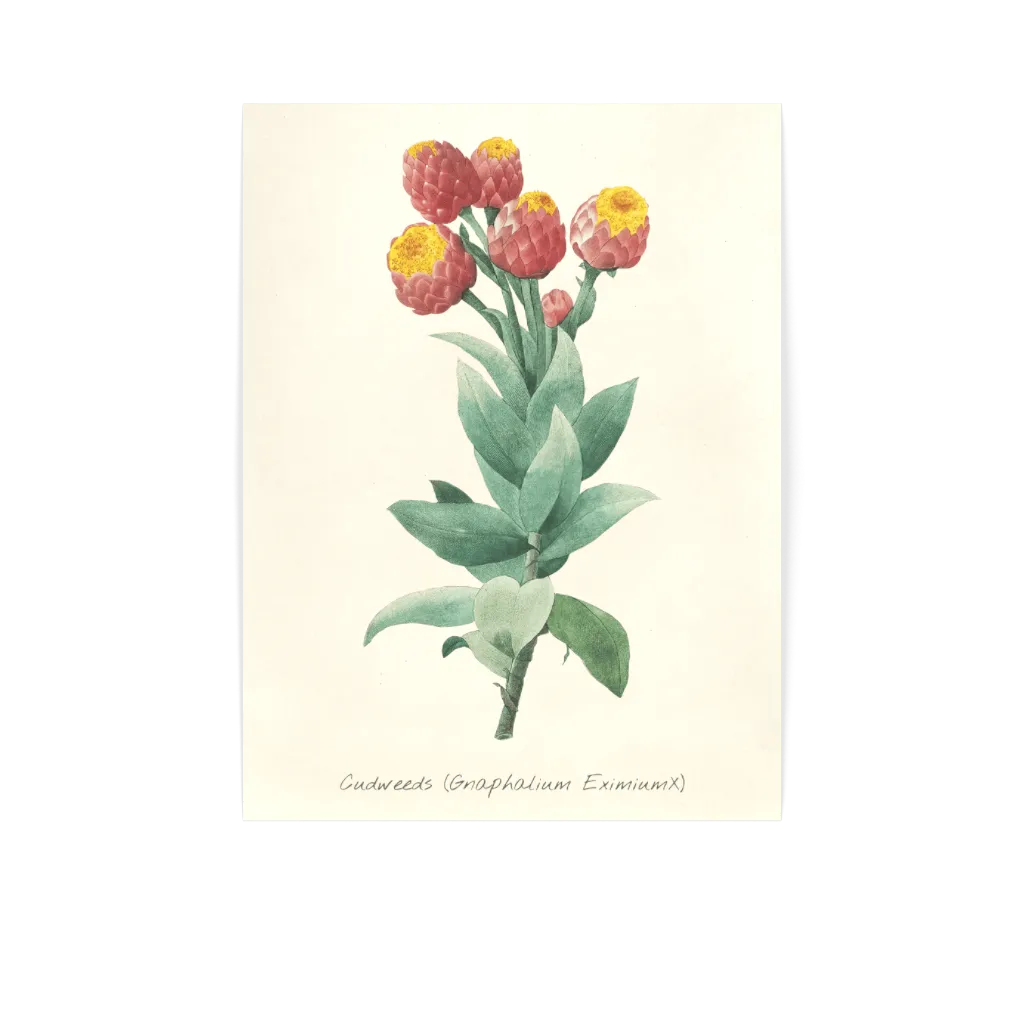 En botanisk studie från en annan tid. Denna vintageillustration fångar cudweeds tunna struktur i mjuka koralltoner och dämpade gröna nyanser. De samlade blommorna med sina gula mittpunkter känns både precisa och stilla nostalgiska, som en sida ur ett gammalt herbarium.