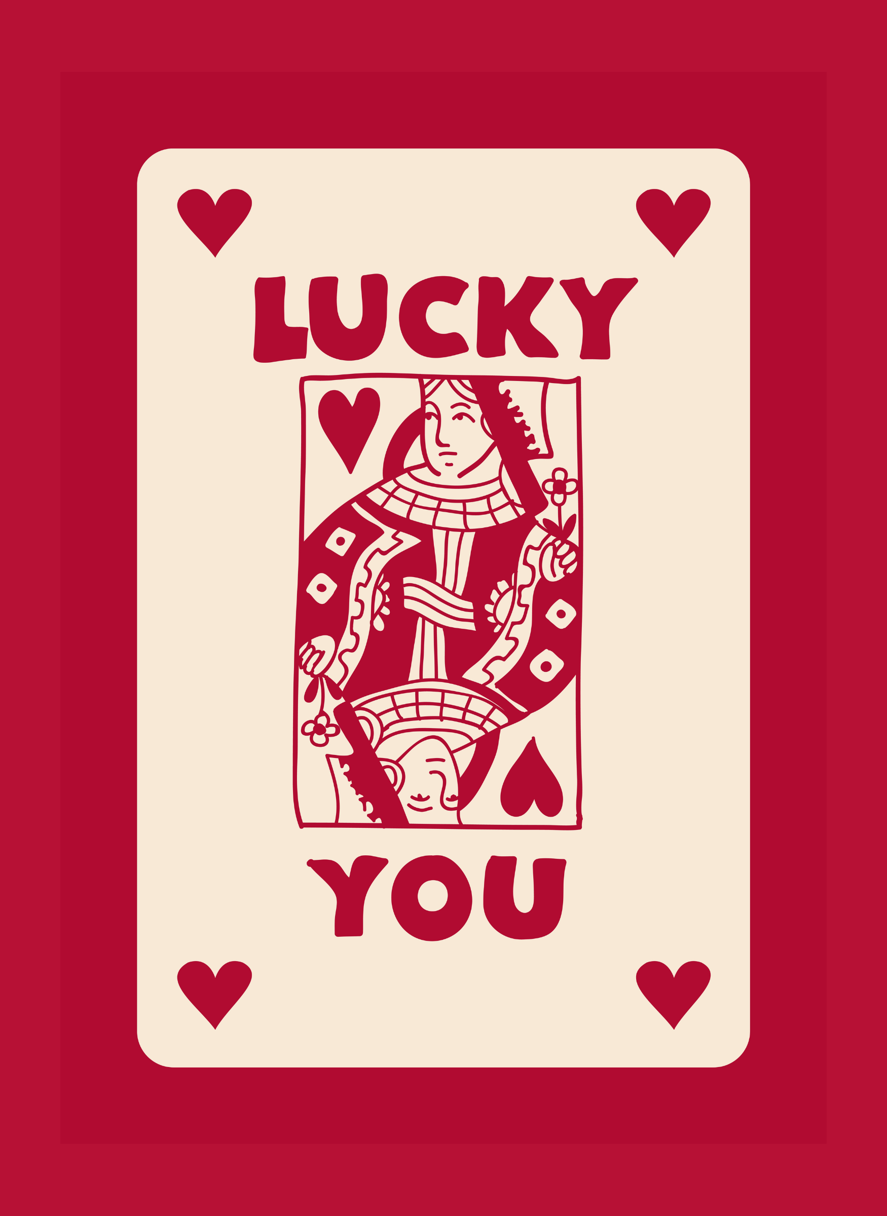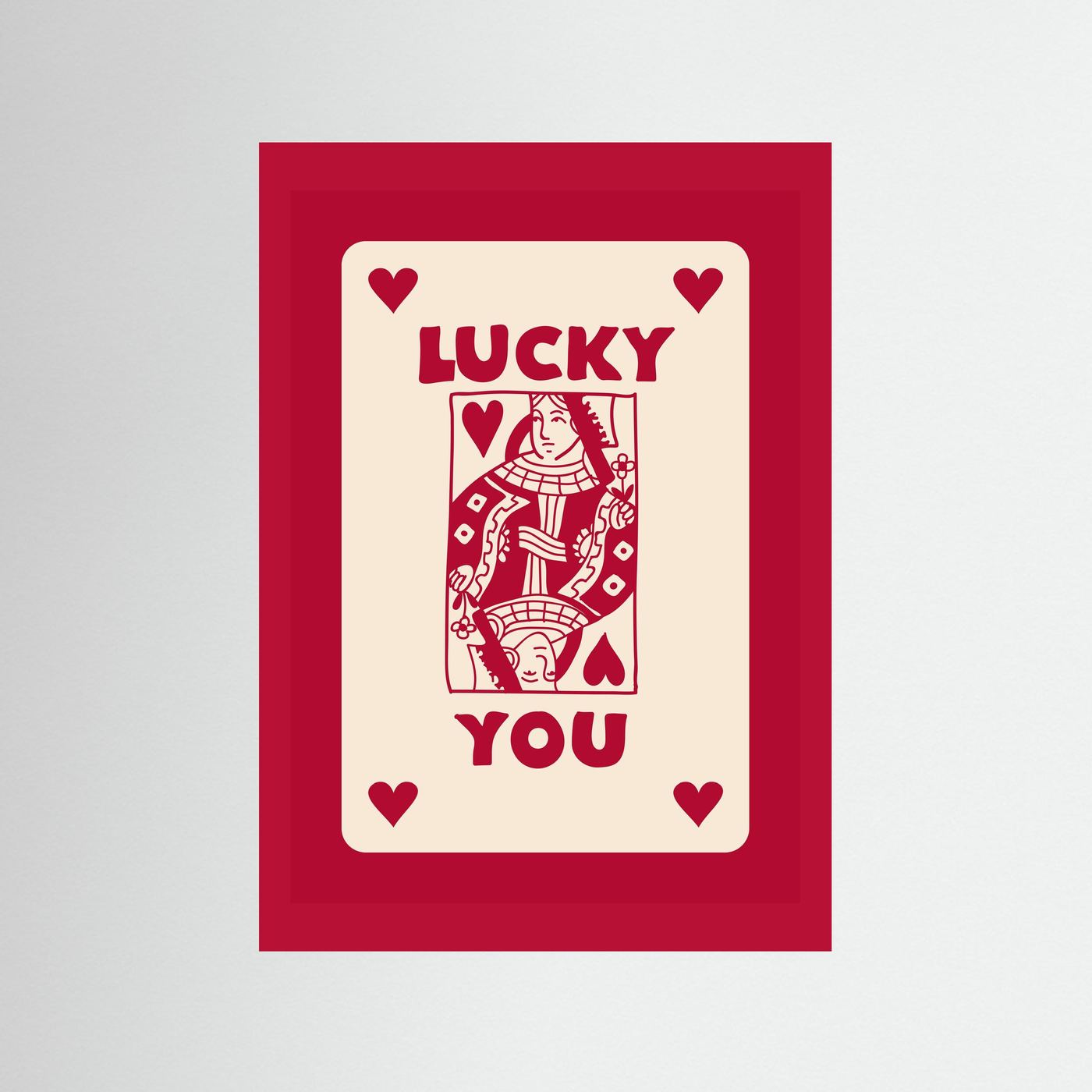 En lekfull tolkning av kortet Hjärter dam, omarbetad med varm vintagecharm. Den djärva paletten i rött och creme ger säker energi till varje rum, medan den klassiska spelkortillustrationen tillför en aning nostalgisk lekfullhet. Budskapet är tydligt och lättsamt, och skapar en inbjudande mittpunkt som väcker samtal.