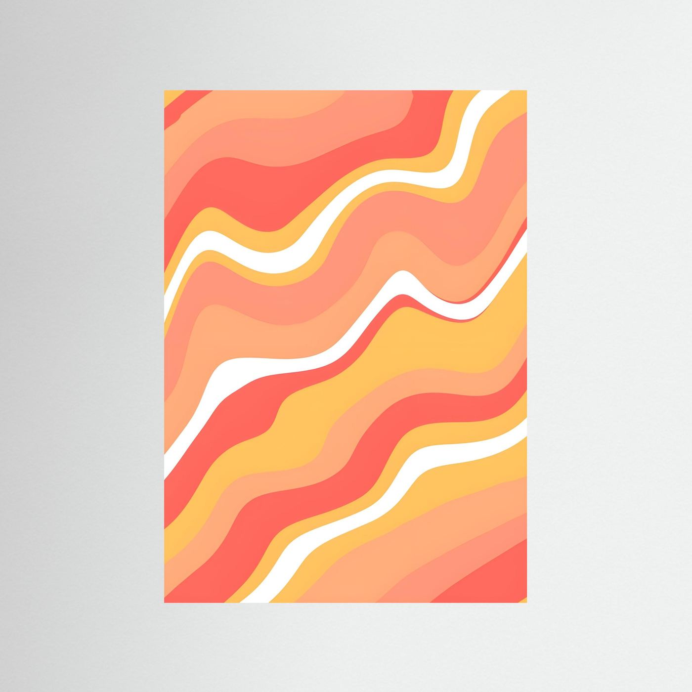 Varmt vågspel rör sig över ytan i lager av korall, orange och gult. Vita kurvor skär genom rörelsen och skapar rytm och flöde. Formgivningen ger energi åt ett rum utan att ta över. Den matta ytan tar varsamt upp ljuset och låter färgerna lysa utan blänk. Passar fint ovanför en soffa, i en läshörna eller tillsammans med andra abstrakta verk i en tavelvägg. Värmen lämpar sig för rum som behöver ett mjukt lyft.