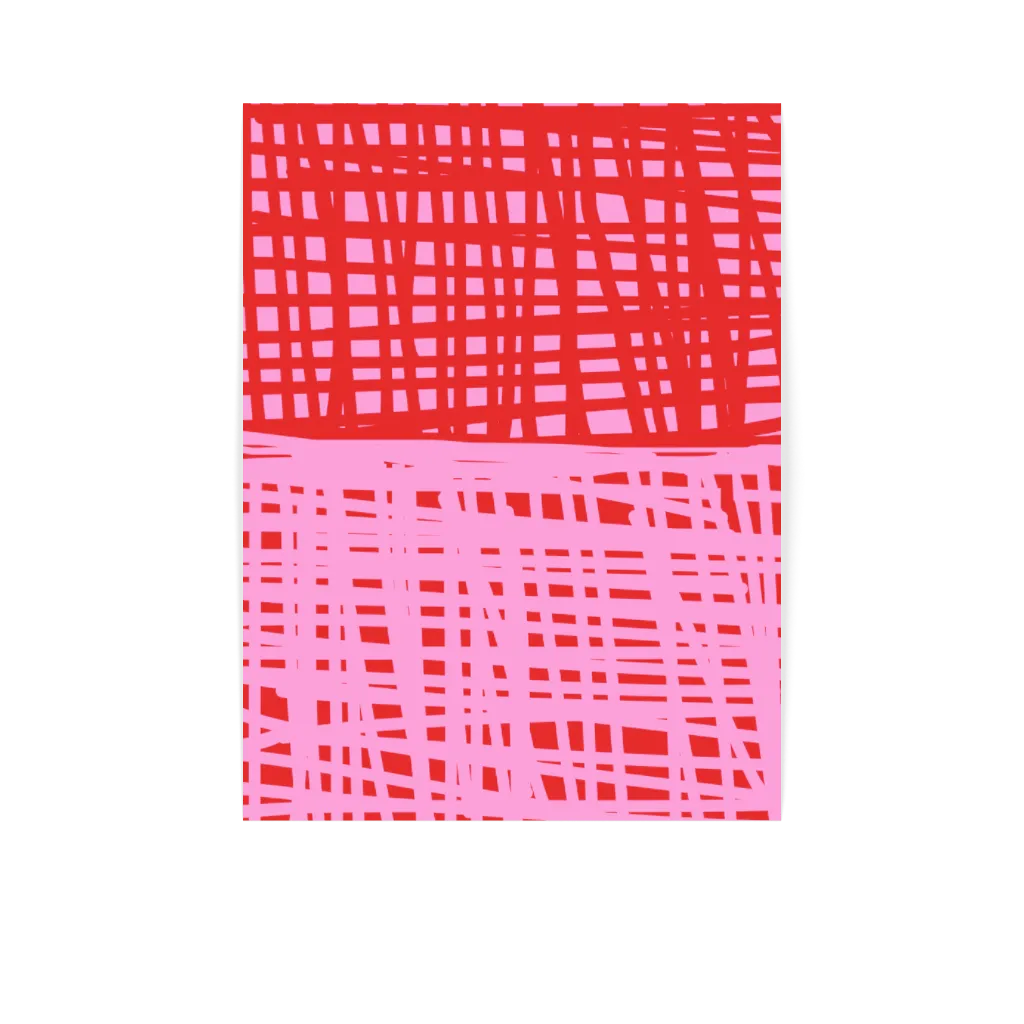 En djärv grafisk komposition där energiska röda linjer väver sig över en mjuk rosa yta. Det handritade rutmönstret rör sig mellan ordning och improvisation och skapar en rytm som känns både strukturerad och spontan. Samspelet mellan det varma röda och det svala rosa ger djup och rörelse åt ytan.