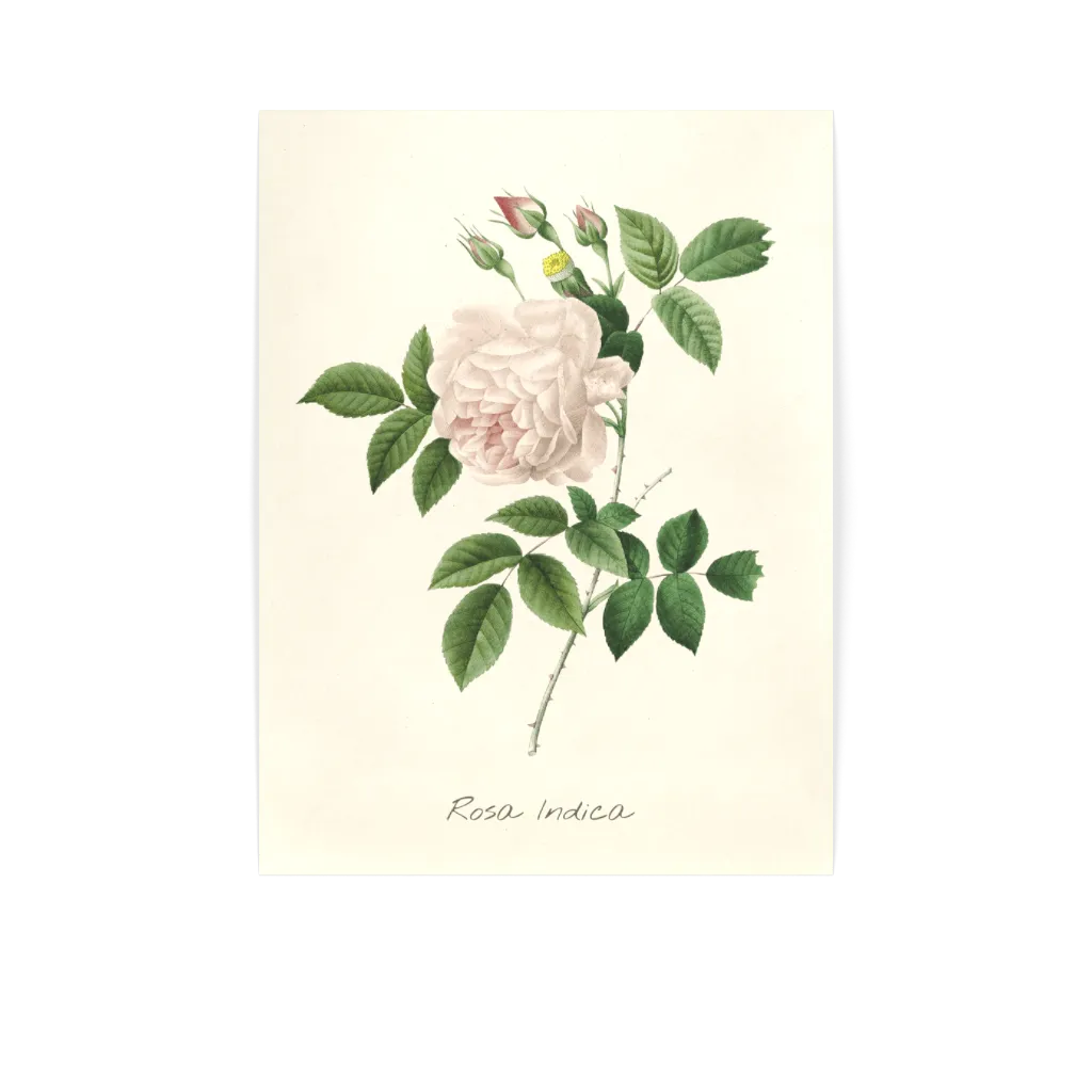 En botanisk illustration av Rosa Indica, återgiven i mjuka rosa toner mot en ljus bakgrund. De skira kronbladen bär på en diskret värme som mjukar upp väggar utan att ta över dem. Gröna blad tillför naturlig balans, vilket gör denna poster lätt att kombinera med ljust trä och linnetexturer. Den för in en stillsam känsla av förfining i sovrum och vardagsrum, och förankrar ett rum med det tidlösa uttrycket hos klassisk botanisk konst. Den dämpade paletten låter andra element andas, samtidigt som den behåller en mjuk närvaro på väggen.