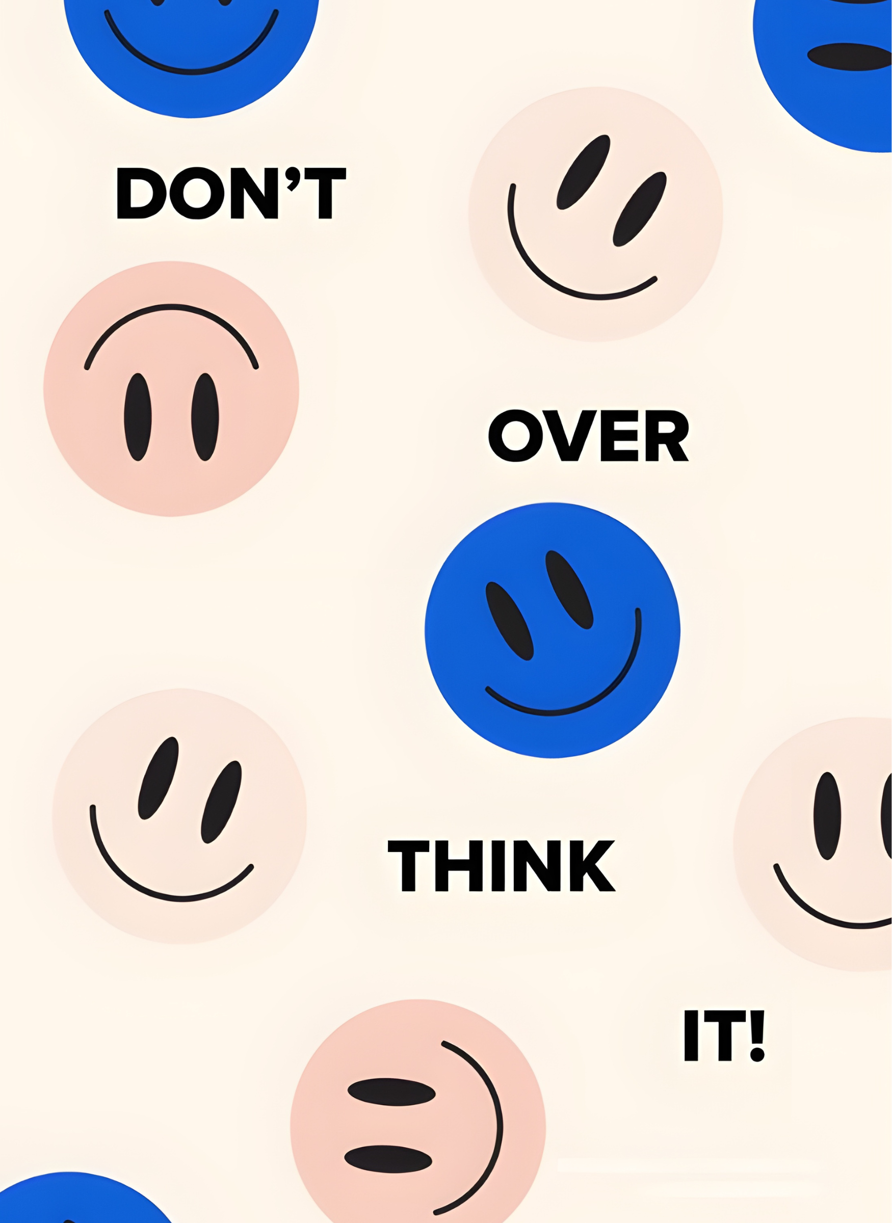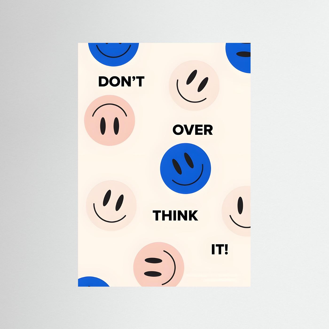 En påminnelse om att släppa taget, återgiven i djärv typografi och lekfulla smileygubbar. Blå och rosa cirklar flyter över en varm beige yta, var och en med ett annat uttryck. Budskapet landar mjukt men stannar hos dig. Denna poster ger en mild känsla av ro till stressiga morgnar i hallen eller stilla kvällar i sovrummet. Den balanserar lättsinne med avsikt och skapar utrymme för lugn utan att bli predikande. Smiley-motiven känns nostalgiska men förankrade i en modern illustrationsstil.